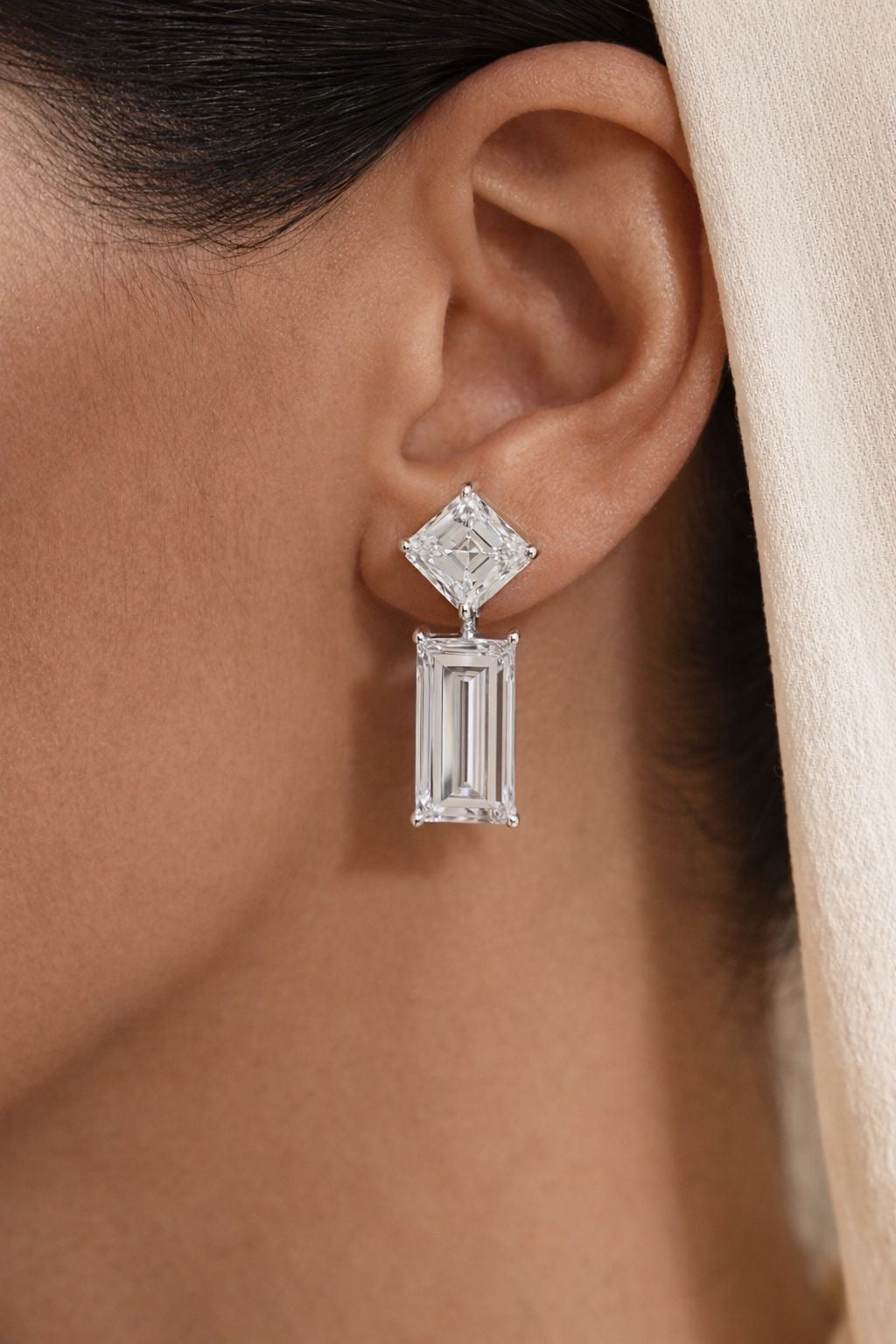 The Noor Al Qasr Drops are a statement in symmetry and strength. A brilliant princess-cut diamond crowns the design, leading into a commanding emerald-cut drop that elongates the silhouette with clean, architectural lines.