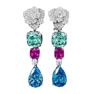 Paraiba Leopard Earrings in 925 sterling silver featuring white lab sapphires and vibrant synthetic Paraibas, designed with a wild-meets-refined aesthetic. Bold yet lightweight, perfect for destination nights and resort dinners."