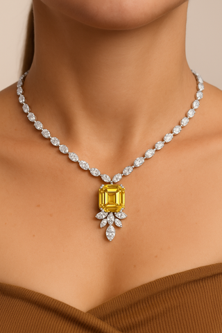 Gold-fused sterling alloy necklace featuring a central yellow lab-created sapphire framed by white sapphires, evoking regal vintage elegance.
