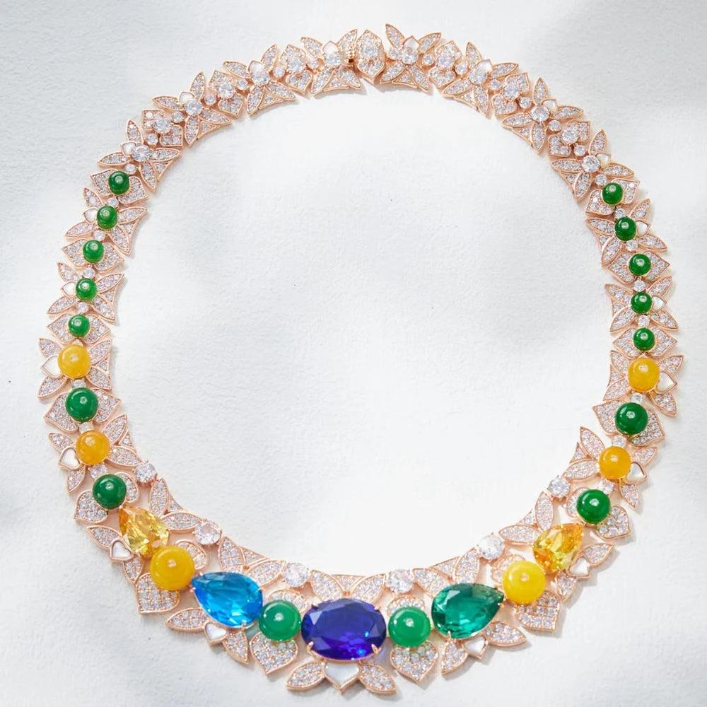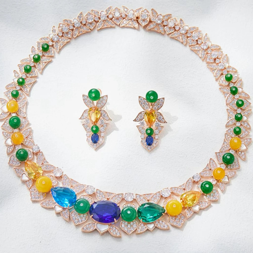 The Garden of Royals Necklace Suite is a timeless expression of elegance, inspired by regal gardens and the enchanting beauty of blooming florals. Crafted with a refined blend of copper and silver, this suite brings together durability, artistry and a touch of grandeur. At its heart lie radiant lab sapphires, chosen for their captivating depth of colour and impeccable clarity, adding a luxurious brilliance to each piece.