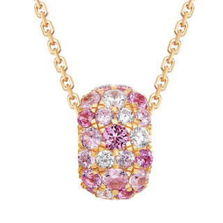 drone view of a luxurious engagement ring featuring a large round brilliant-cut white gemstone at the center, surrounded by multiple pink and white sapphires set in a rose gold band.