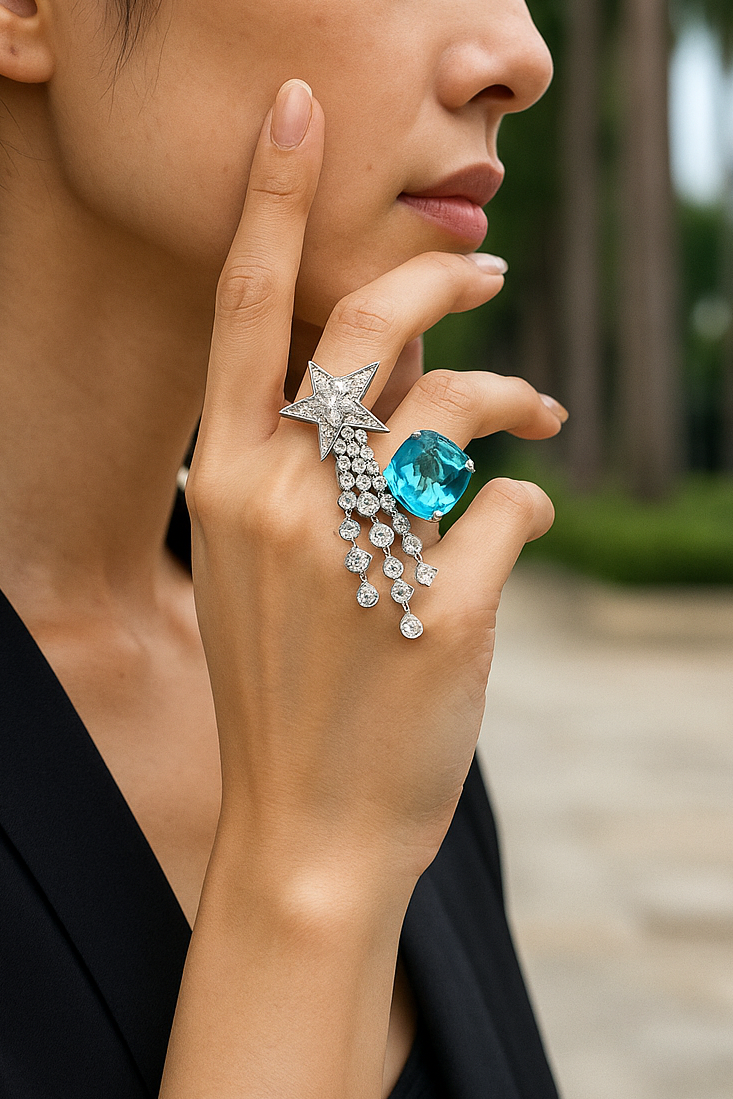 To preserve the brilliance of your Comet Bleu Ring, avoid exposure to water, perfume, and harsh chemicals. Gently clean with a soft dry cloth and store in a lined jewellery box when not in use.