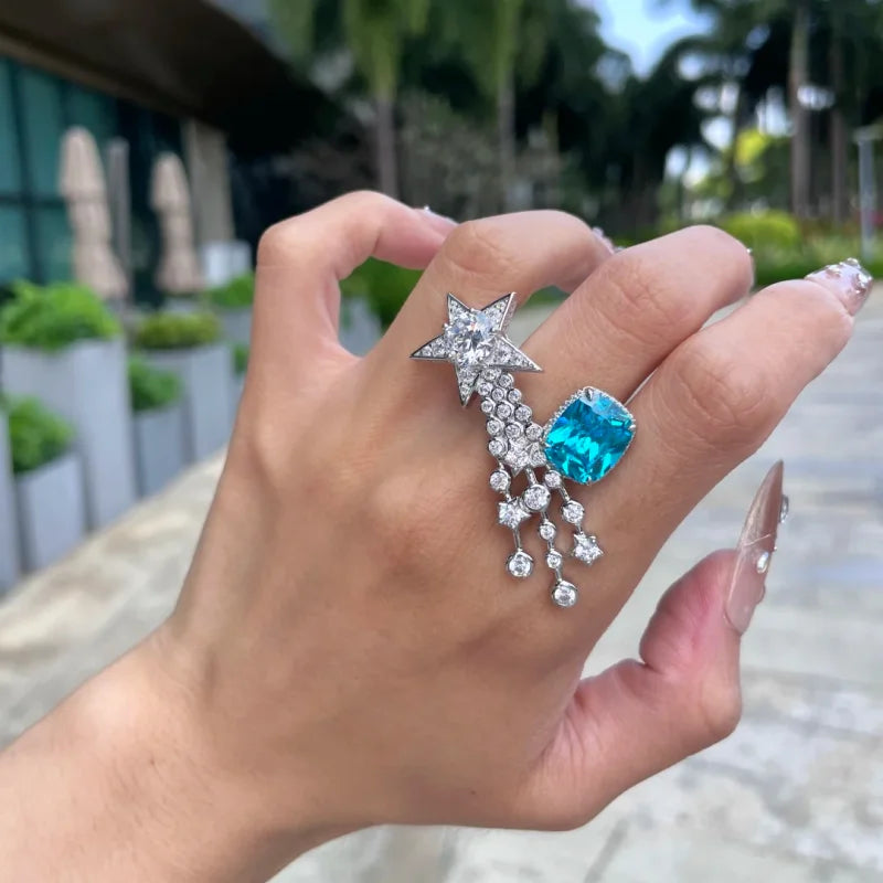 Crafted in 925 sterling silver, the ring combines lasting strength with a sleek, polished finish that perfectly complements the sapphire’s vibrant hue. Designed as a cocktail ring, it offers a striking statement for special occasions or to elevate everyday elegance, balancing sophistication with a hint of cosmic allure.