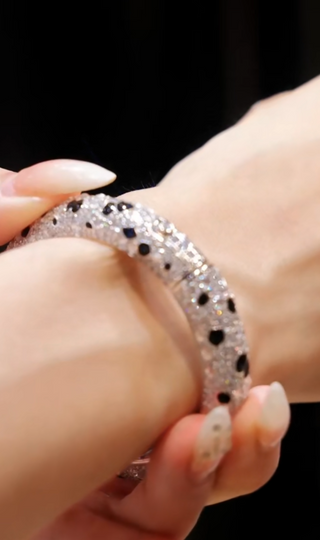 Leopard Spots Bangle crafted in 925 sterling silver with lab-created sapphires, featuring bold animal-inspired pattern in a sleek, travel-friendly design.