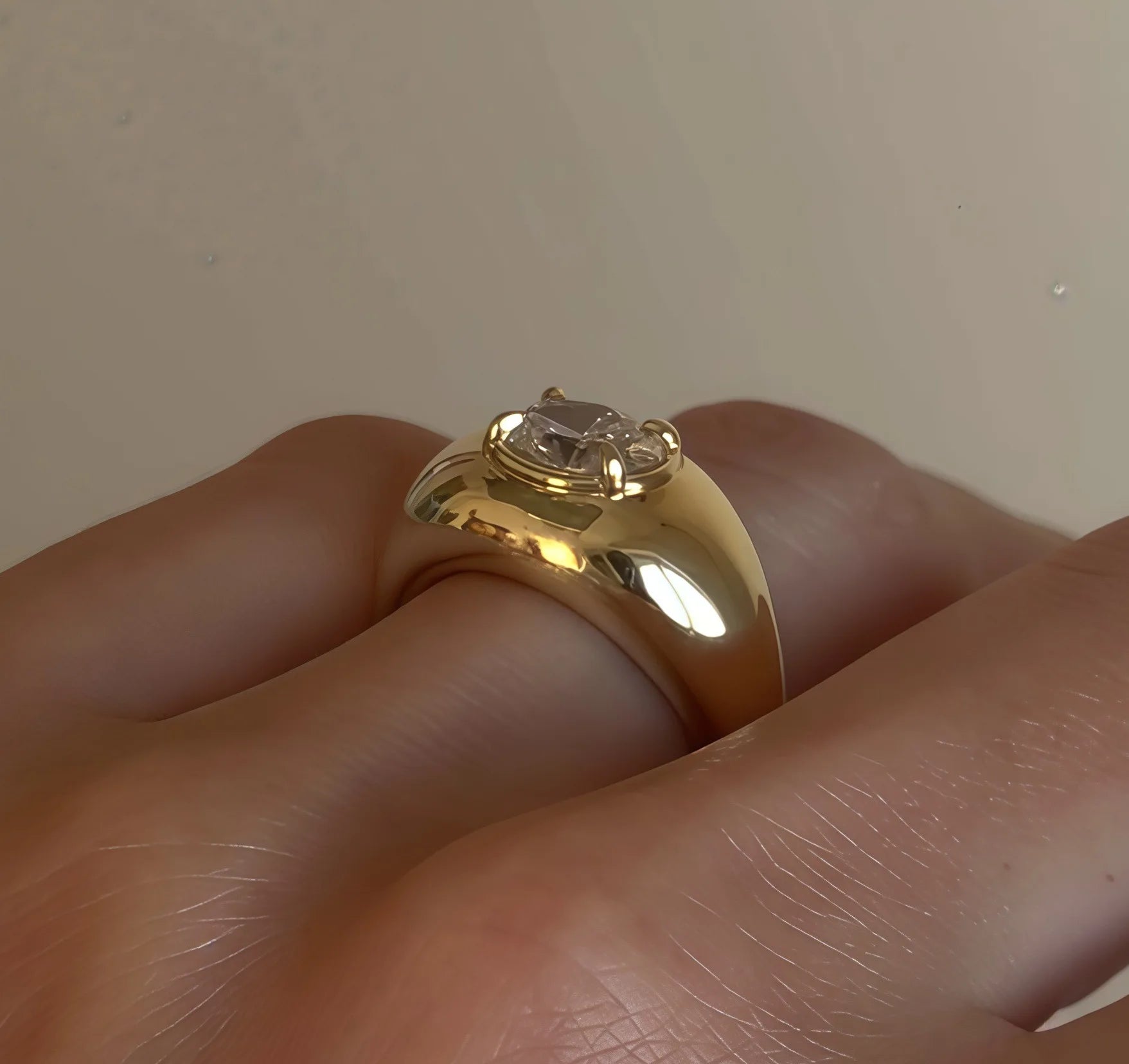 Crafted in 925 sterling silver with a smooth, sculptural profile, this ring has a confident presence on the hand. The polished surface and generous proportions give it a modern heirloom feel, striking the balance between statement and sophistication.