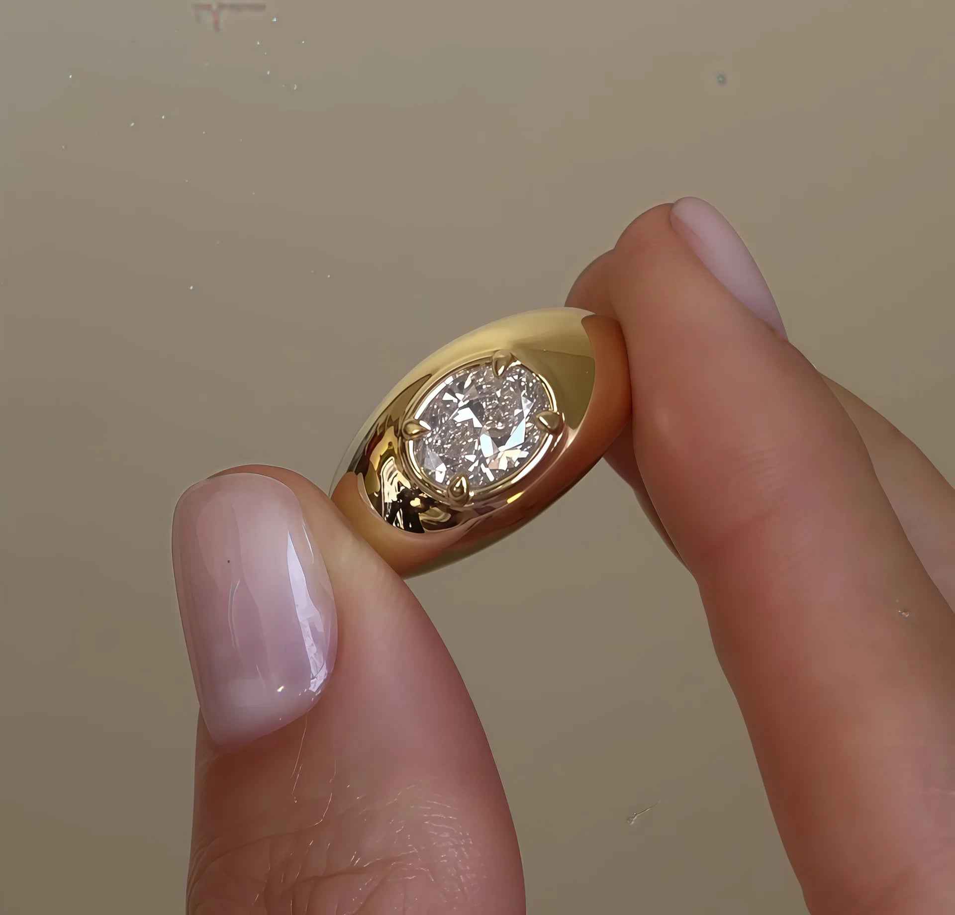 Bold, fluid, and quietly powerful, the Aurea Oval Ring is designed to feel substantial without feeling heavy. At its centre sits a 1.5 ct oval-cut D-colour moissanite, GRA certified for exceptional brilliance and clarity. The prong setting is refined and secure, allowing light to enter from every angle while keeping the stone beautifully framed.