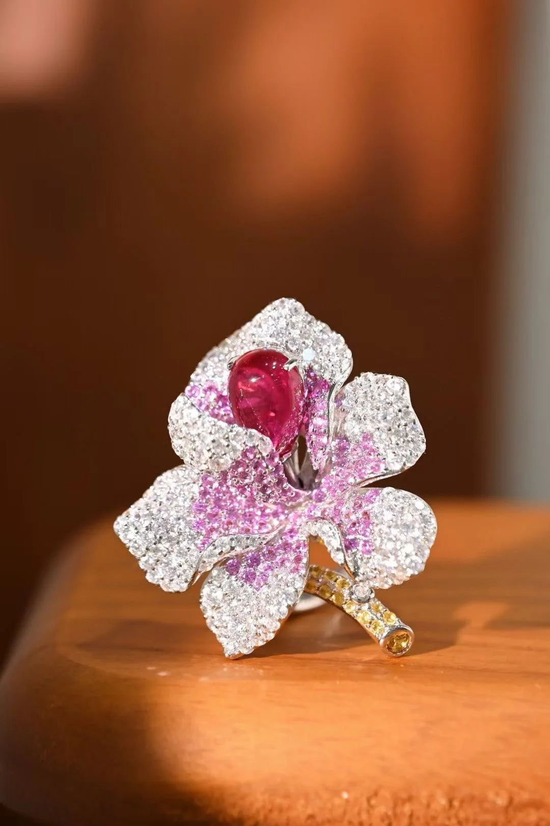 Every curve and contour of the design echoes the natural elegance of the orchid, with the lustrous silver frame enhancing the gemstone’s vibrant glow. The result is a masterpiece that feels both dramatic and sophisticated, ideal for those who wear their confidence as effortlessly as their style.